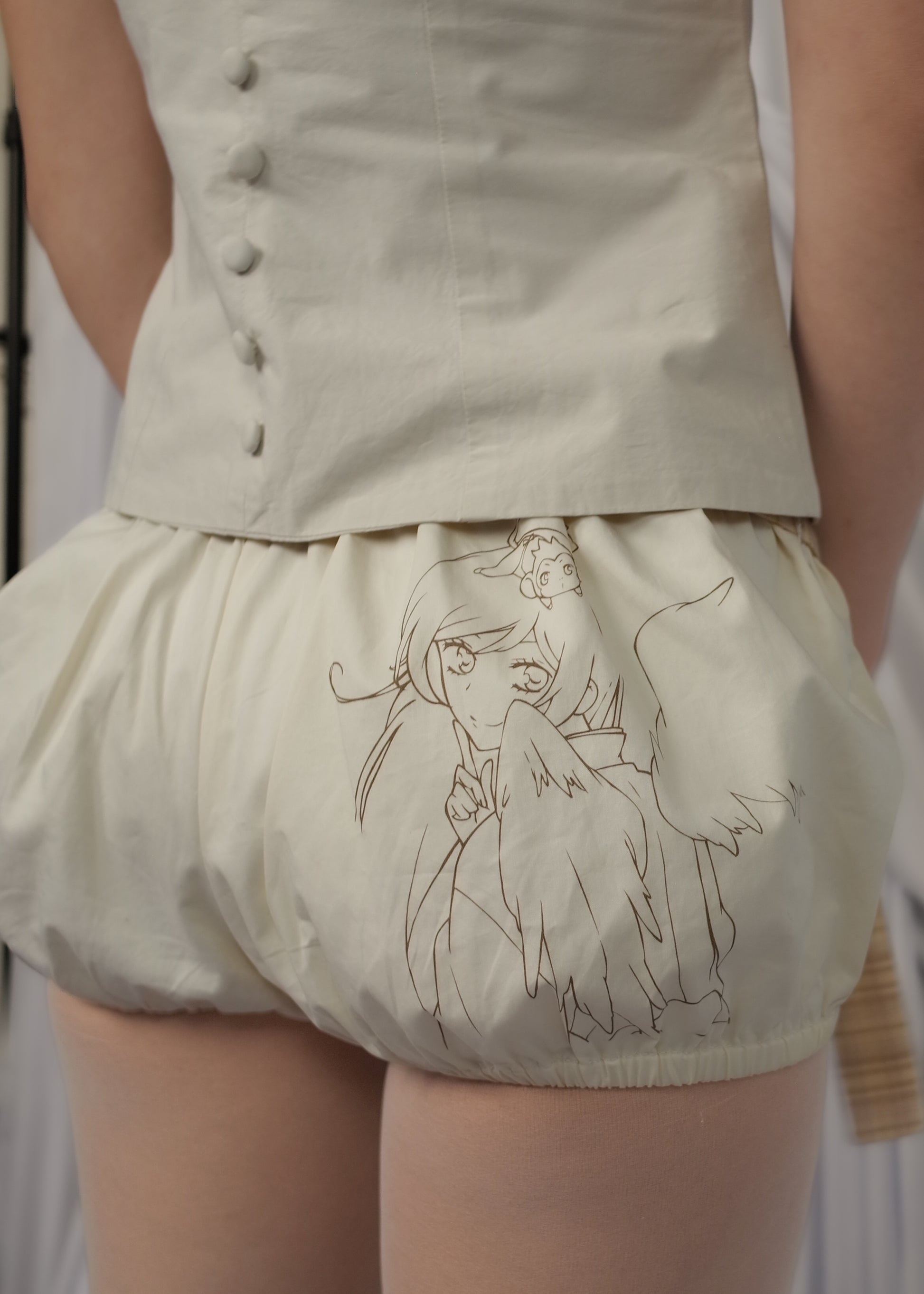 The Nanami Bloomer Shorts are made from 100% cotton and have a low-rise, voluminous mini short fit. They feature a printed visual of Nanami from Kamisama Kiss 2 on the back. The shorts come with a removable plaid sash belt that has been tied into a bow.